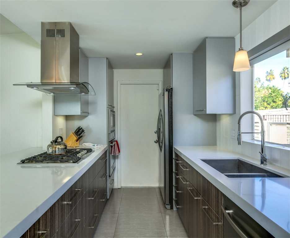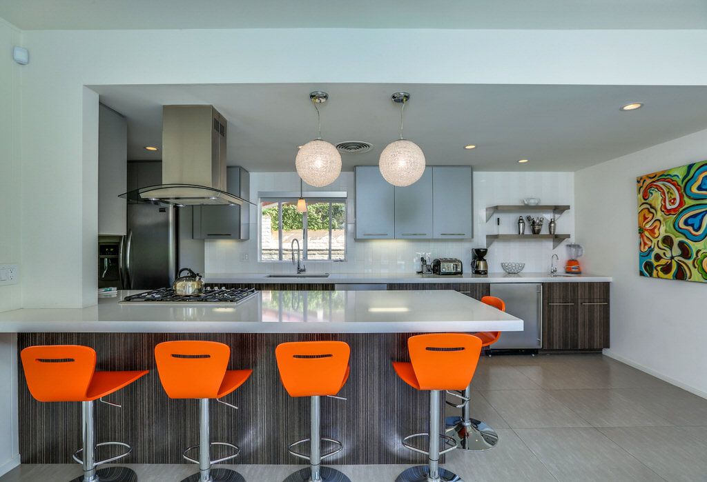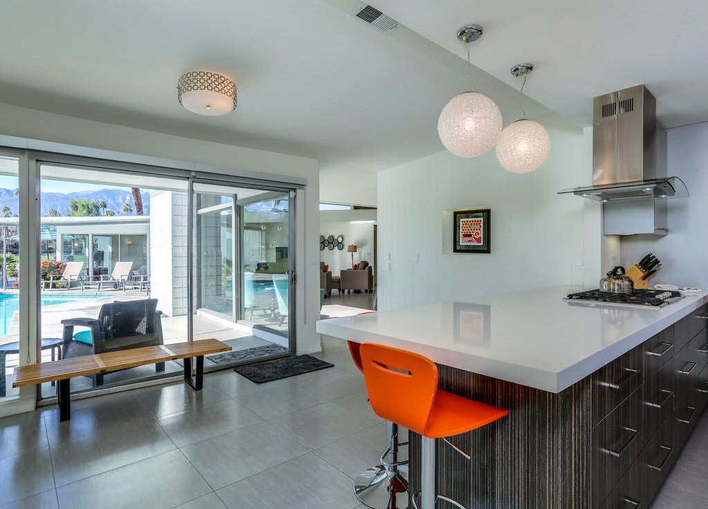 The kitchen of this 3 bedroom Rancho Mirage home for rent has been fully updated with all new stainless-steel appliances, a 5 burner gas cooktop, Caeserstone counter tops, breakfast bar for five, and all of the small appliances and utensils you'd find at home.