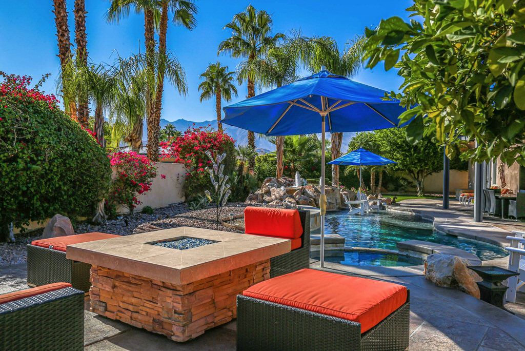 This Rancho Mirage vacation home features a large freeform pool with an attached spa and a fun cascading waterfall feature. This fully landscaped space also features a fire pit, numerous chaise lounges, umbrellas, a gas-line barbeque grill and distinct areas to gather and relax. The outdoor area is a beautiful setting to enjoy the year-round sunshine Rancho Mirage is famous for.
