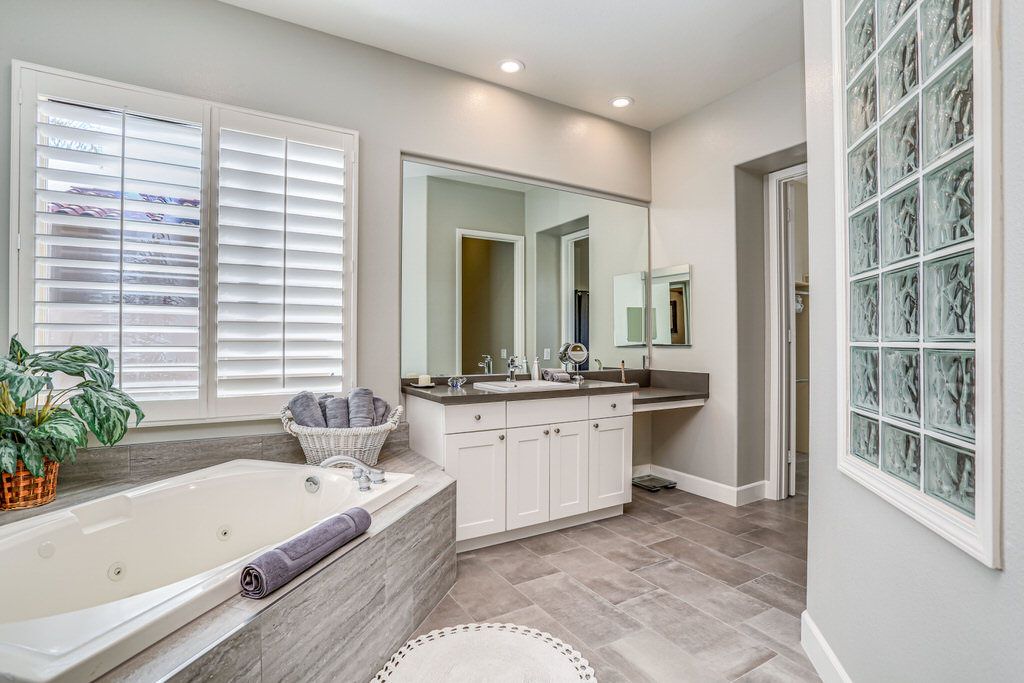The master bedroom is spacious with a California king bed, large television, a massive electric massage chair and has an en-suite bath with a sizable walk-in shower, dual sinks and a soaking tub.