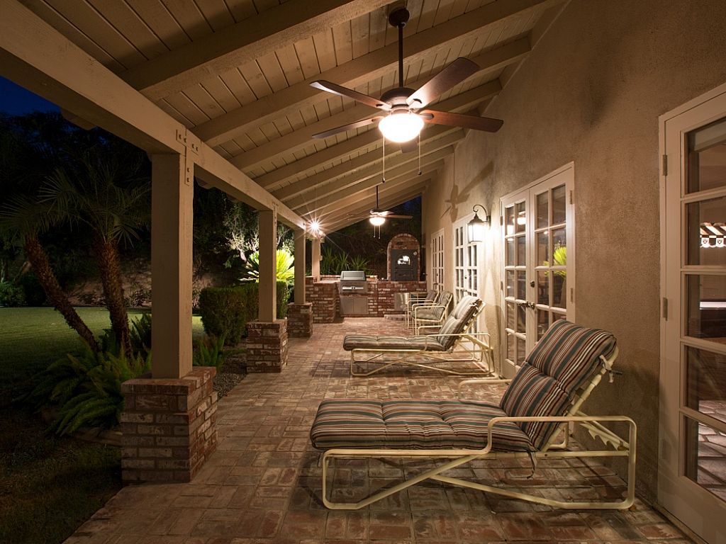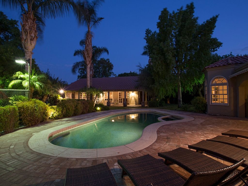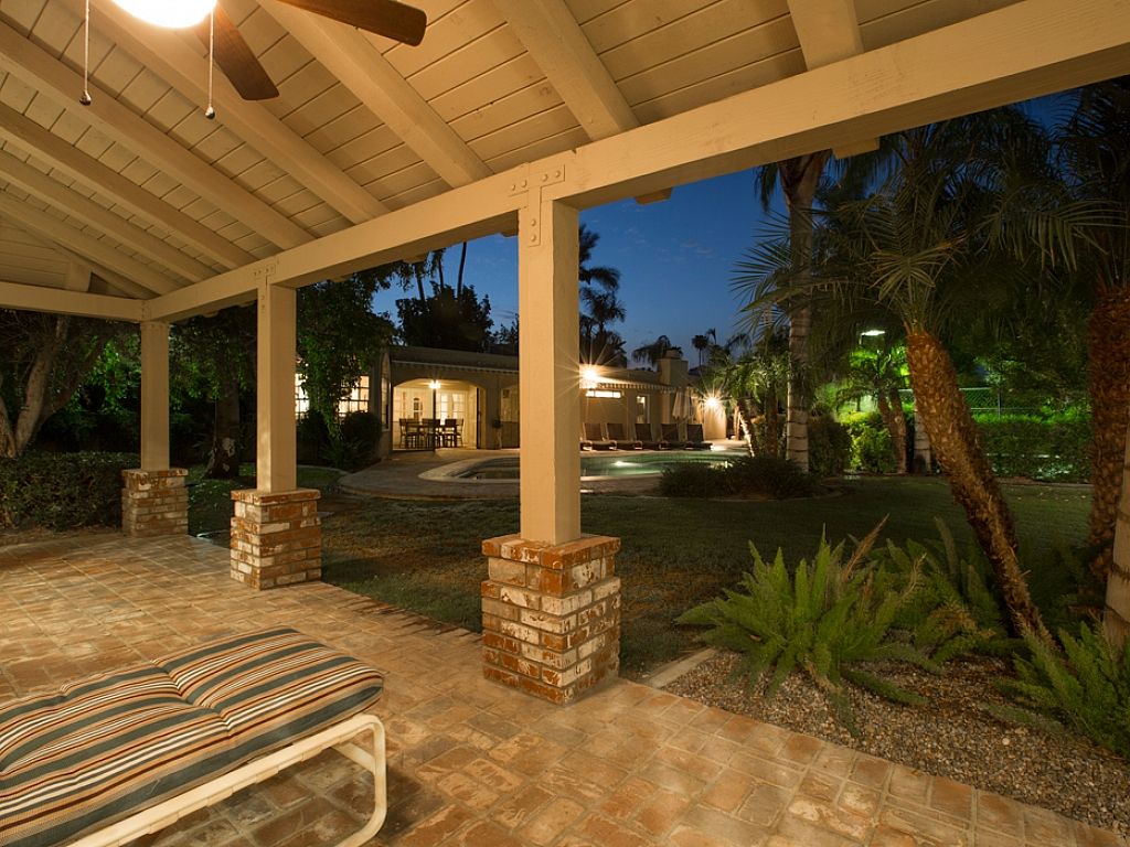 The private pool area of this Rancho Mirage vacation estate is extraordinary The outdoor area of this vacation home is beautiful in both day and night. At dusk, landscape lighting spotlights the resort-like qualities of this outdoor oasis.