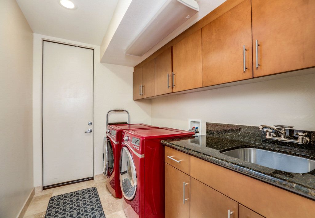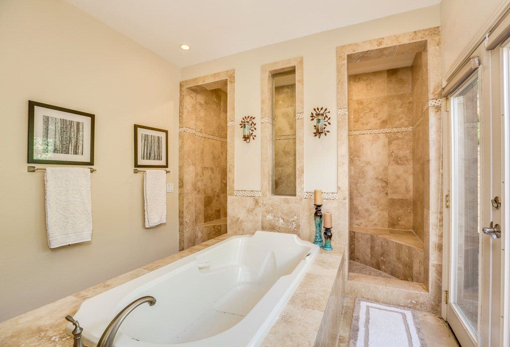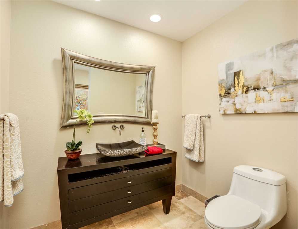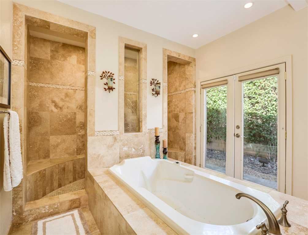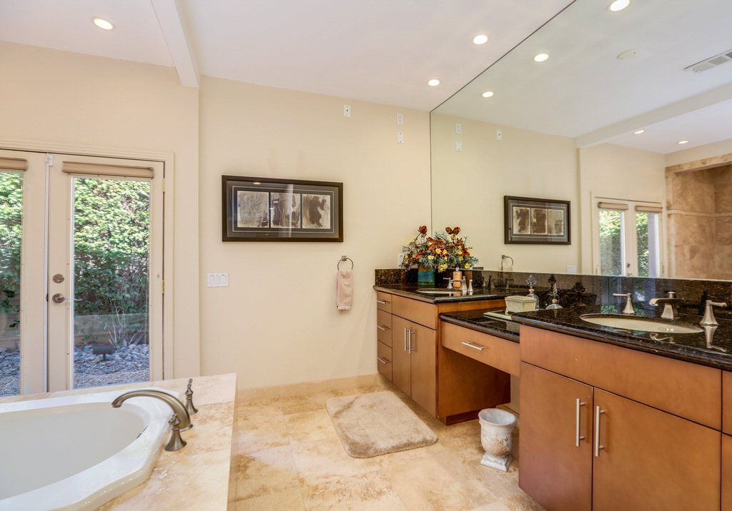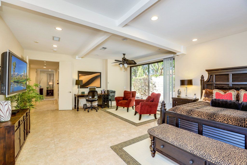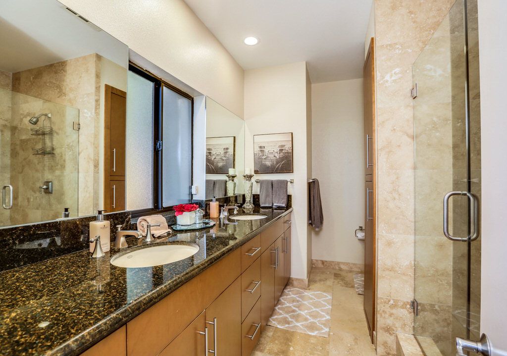 The master suite also offers a seating area, writing desk, 42"" TV/DVD and steps directly out to the pool and spa area. The lavish en-suite bath offers a luxurious step-up soaking tub, his and hers vanity and a custom his and hers shower with duel entry.