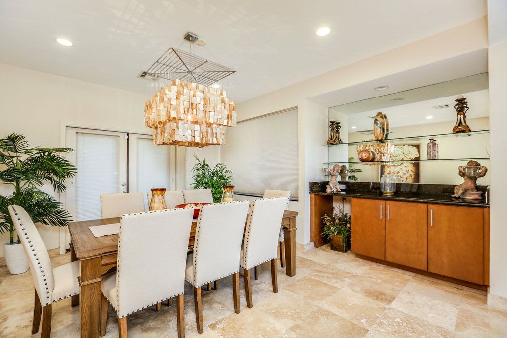 The formal dining room, just of the kitchen, with an impressive dining table, seating for eight and over looks remarkable views of the nearby mountains.