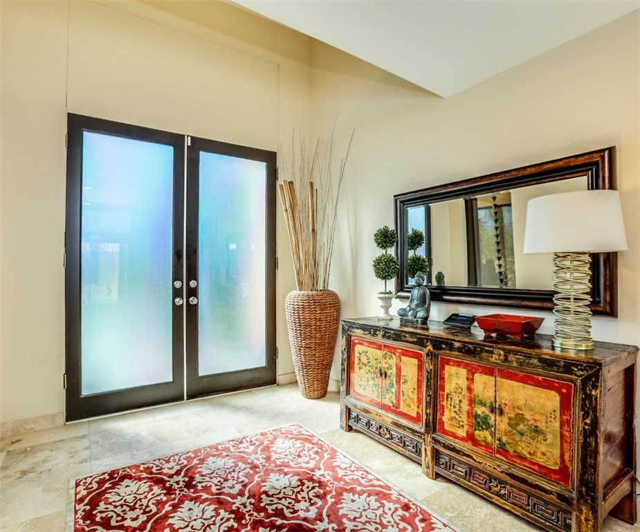 The dramatic entrance opens to a spacious foyer and stunning step-down great room with high ceilings and a spectacular back-drop of wall to wall glass windows overlooking an expansive private patio with sparkling pool and spa.