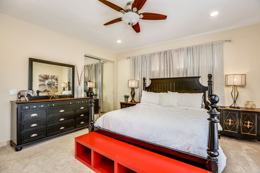 The second guest bedroom is located just off the kitchen and butler's pantry. This bedroom is furnished with a lovely Queen size bed, TV, private entrance off the side yard and en-suite bath with walk in shower. This room would be ideal for a caregiver, nanny, and mother-in-law or for family members who desire privacy away from the main living areas.