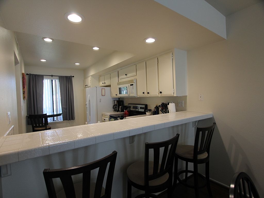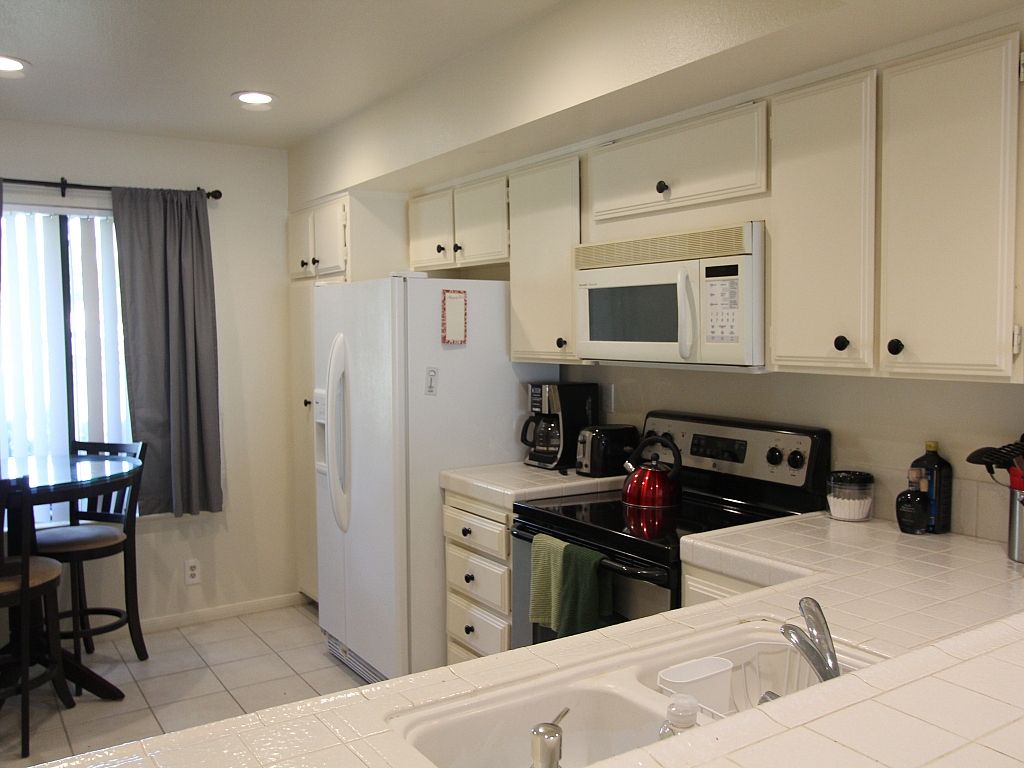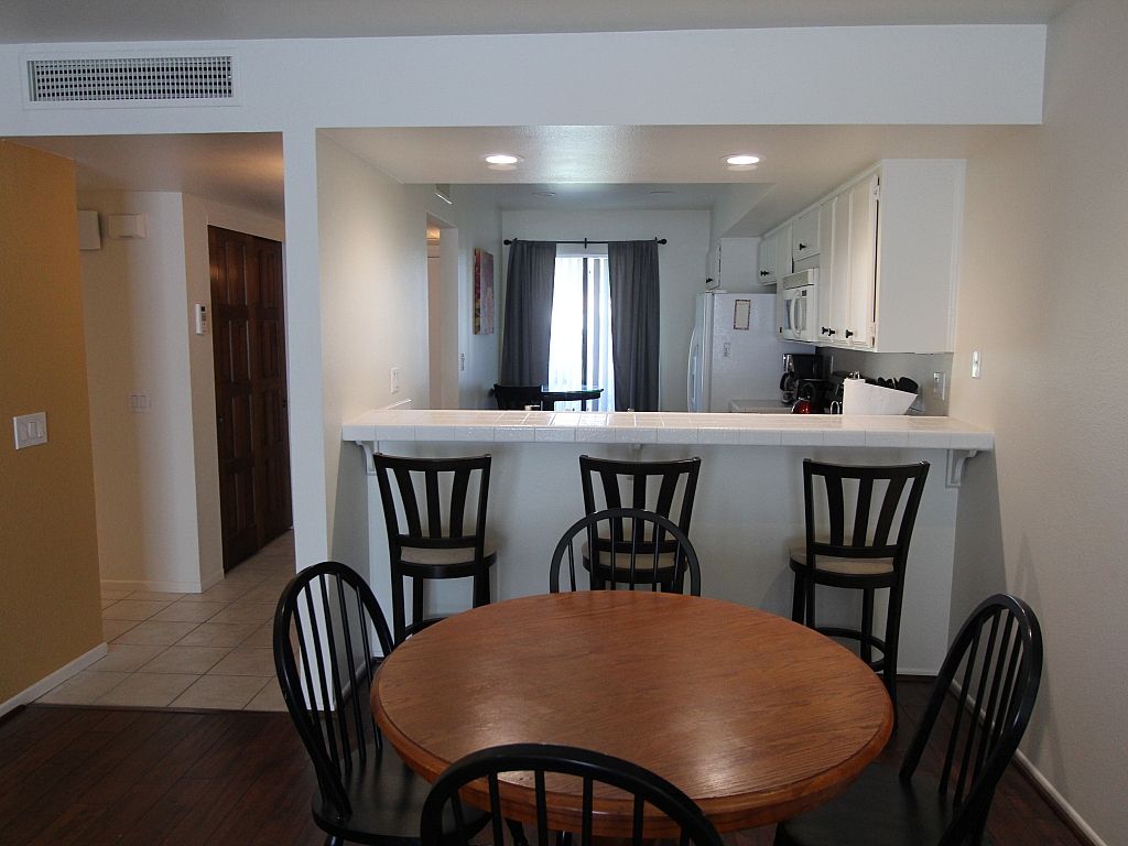 The kitchen in this Rancho Mirage vacation condo is located adjacent to the dining room separated by a breakfast bar with seating for 4. As well as additional table in the kitchen if preferred to enjoy your morning coffee with views of the San Jacinto mountains. The kitchen is very well equipped with everything you need from dishes and cookware.