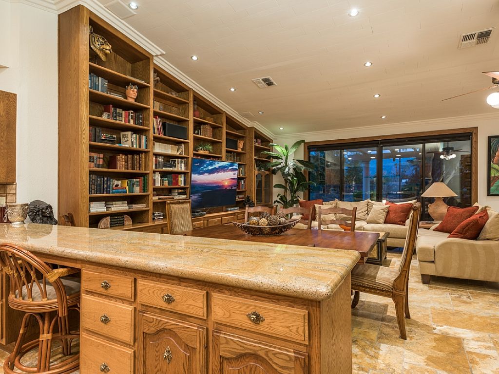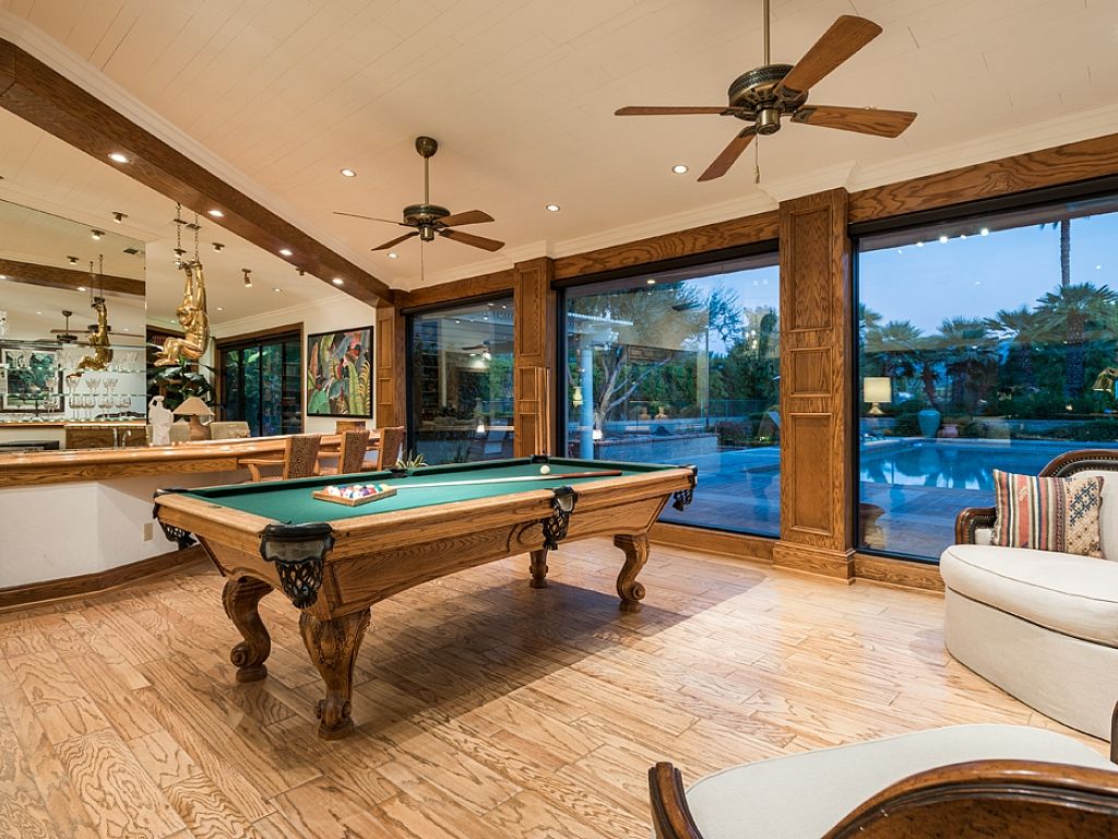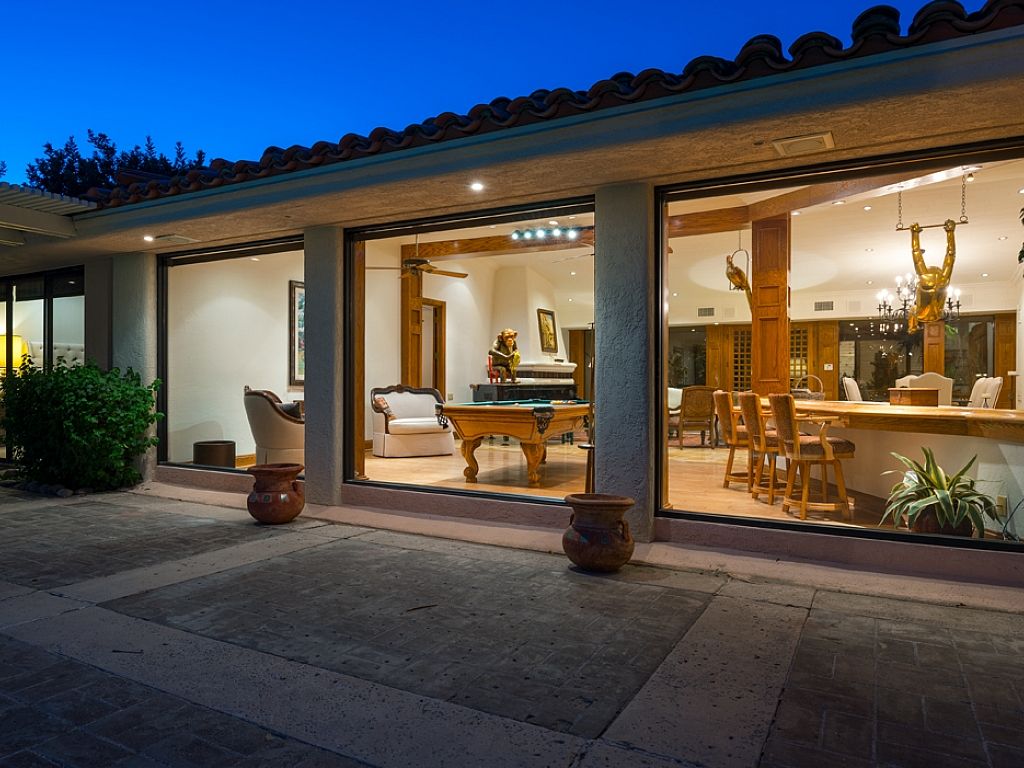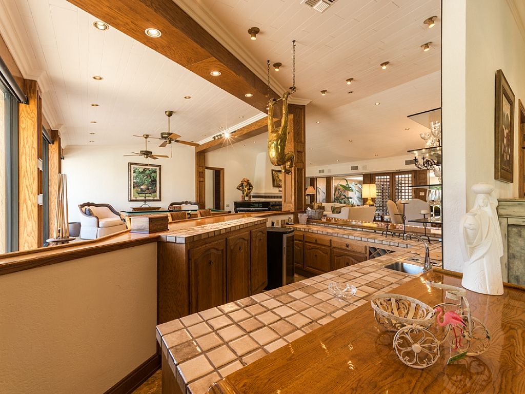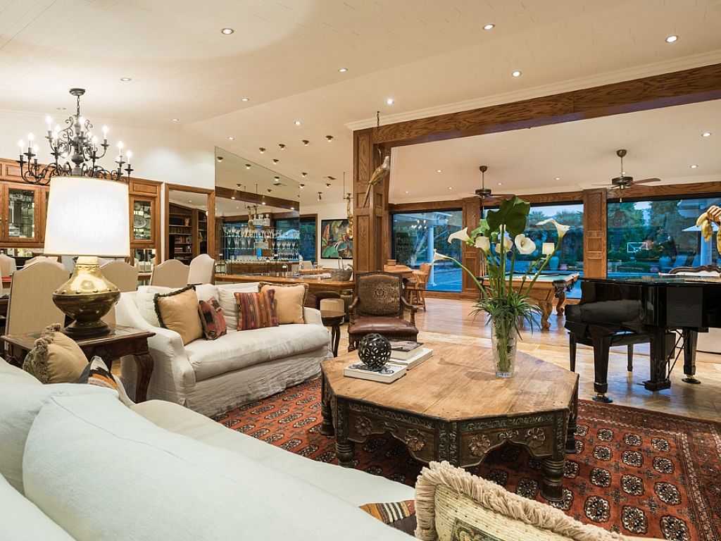 Inside, you'll find this Rancho Mirage luxury estate has an open concept with a generous floor plan, spacious interiors, high ceilings and fine furnishings and artwork throughout. The main house features two entertainment rooms; the main room features a 75"" Samsung LED flat screen and is open to the kitchen, as the neighboring room encompasses a large professional wet bar, piano, pool table, and panels of glass that flank the pool deck showcasing the remarkable outdoor scenery.