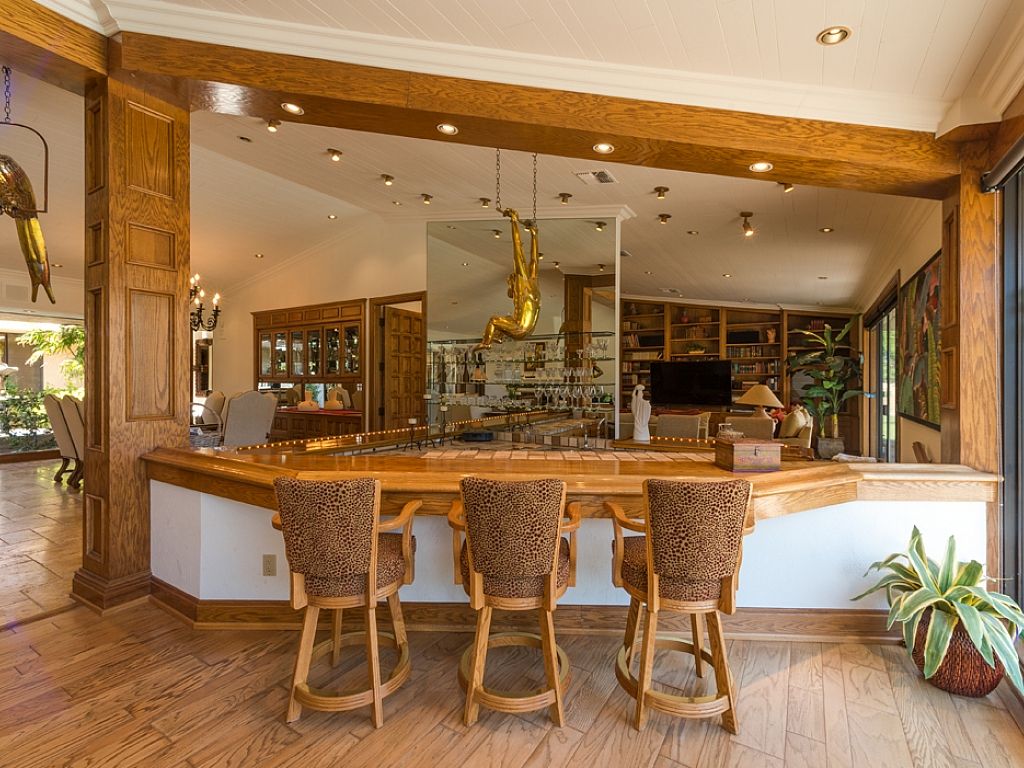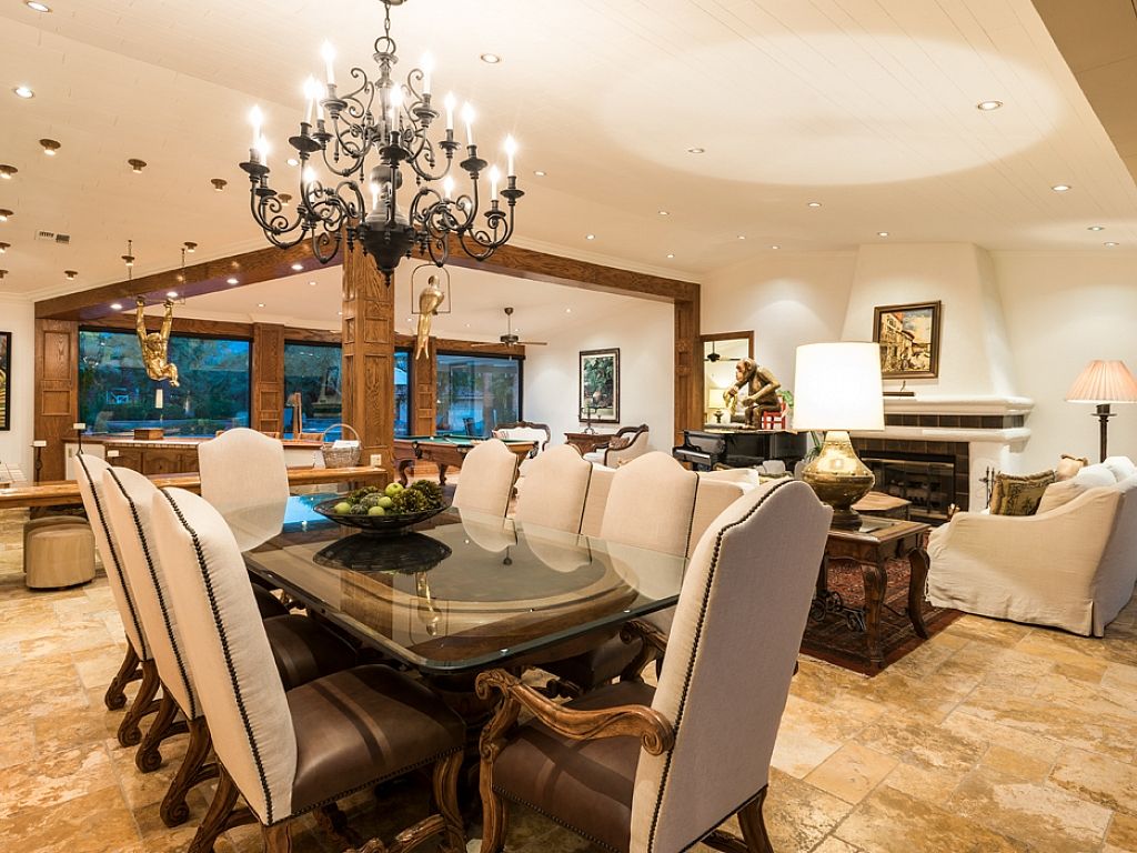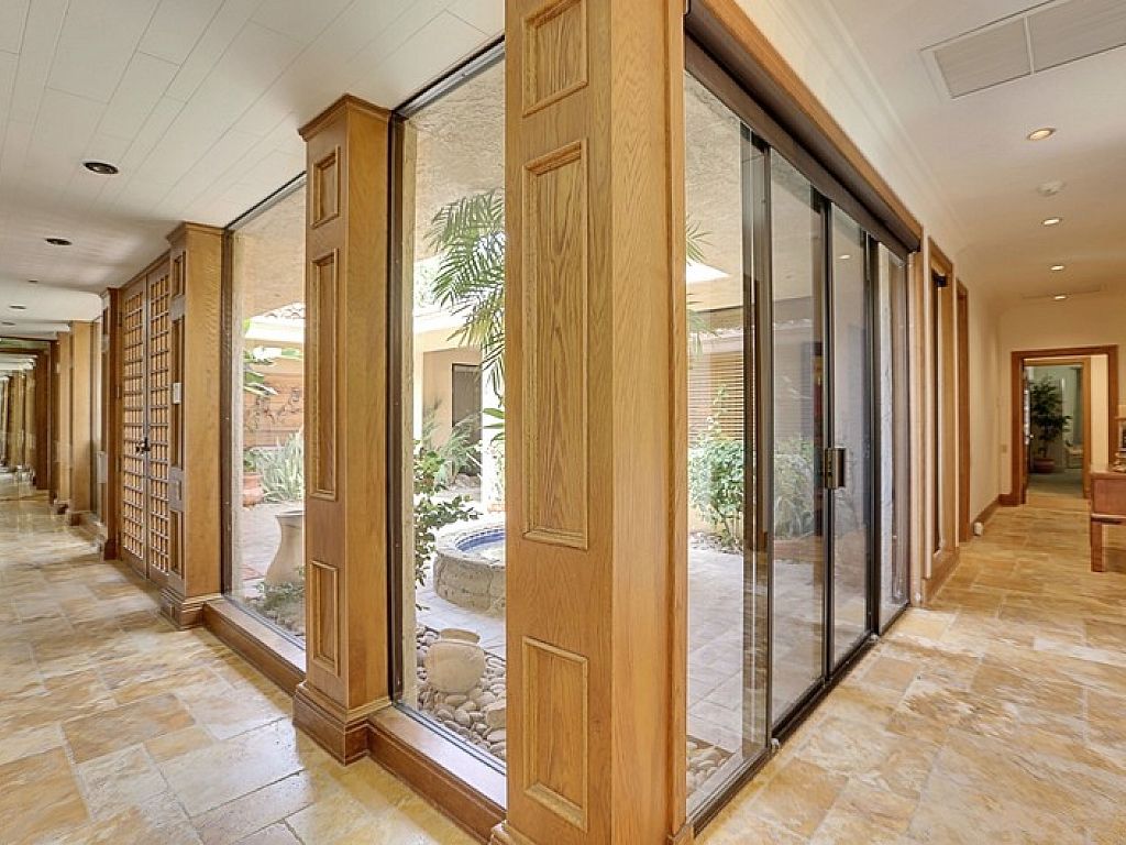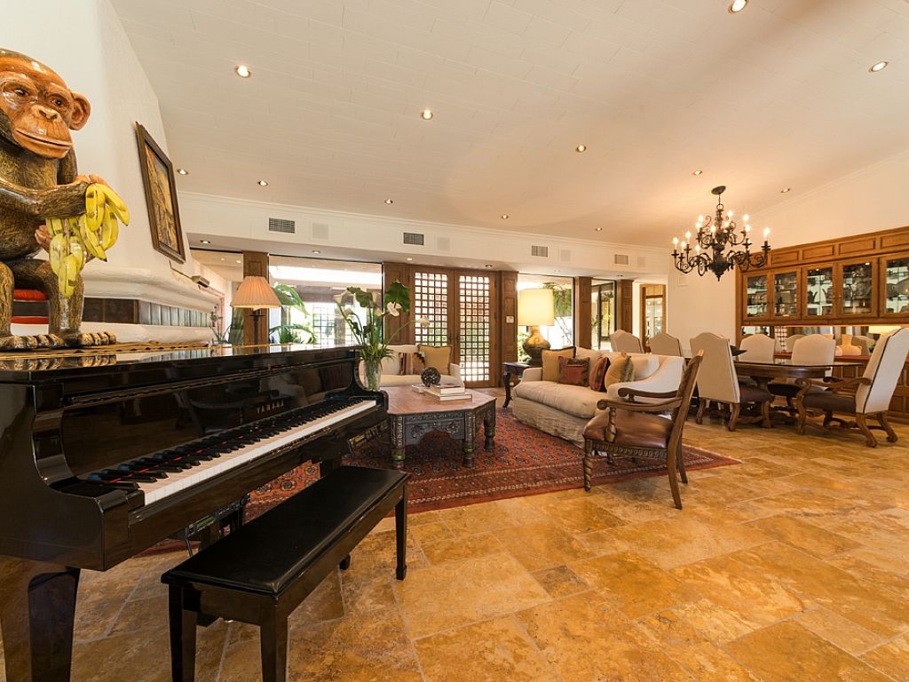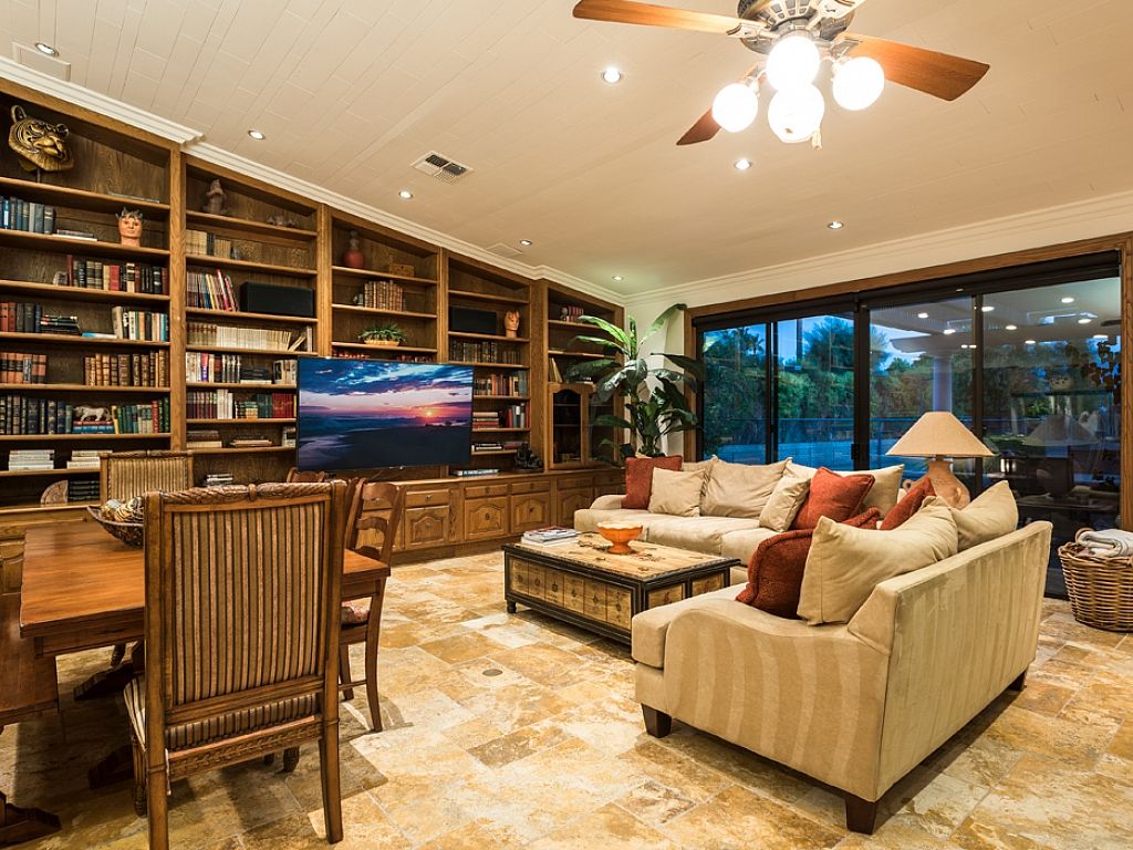 Inside, you'll find this Rancho Mirage luxury estate has an open concept with a generous floor plan, spacious interiors, high ceilings and fine furnishings and artwork throughout. The main house features two entertainment rooms; the main room features a 75"" Samsung LED flat screen and is open to the kitchen, as the neighboring room encompasses a large professional wet bar, piano, pool table, and panels of glass that flank the pool deck showcasing the remarkable outdoor scenery.