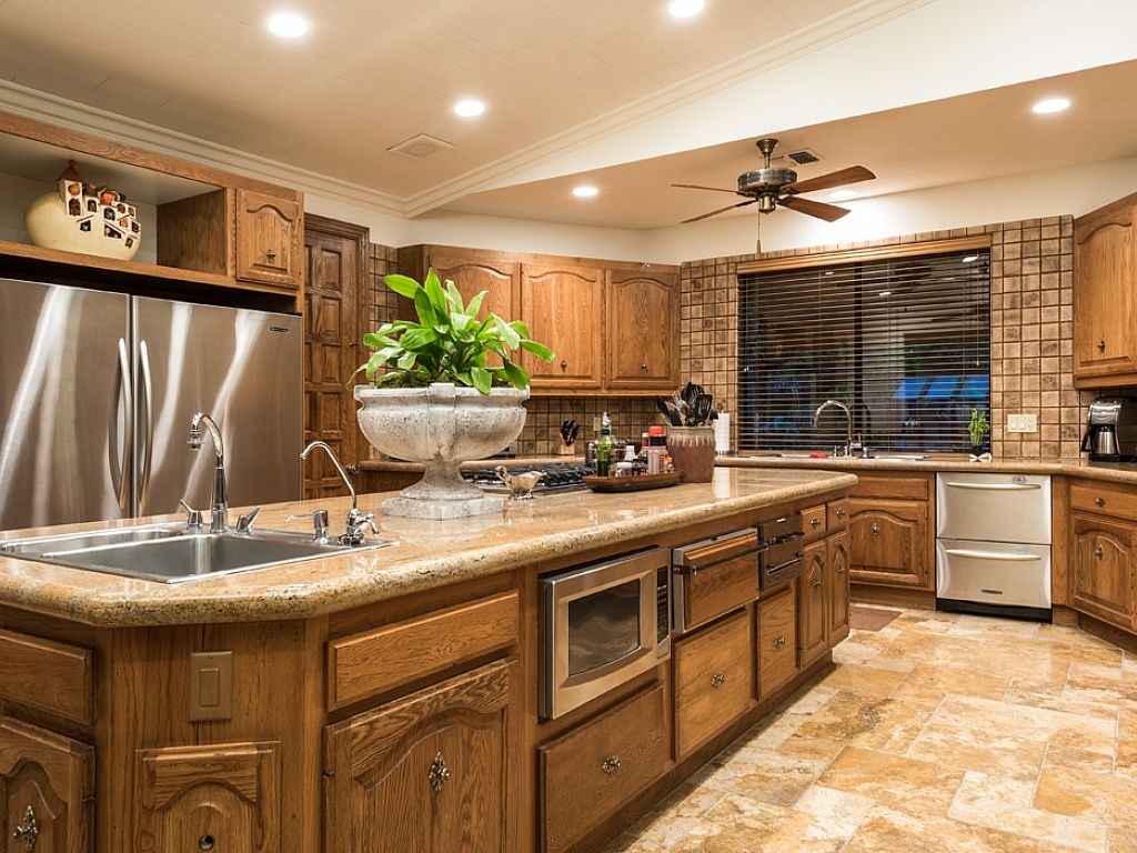 The expansive contemporary kitchen features two sinks, a large peninsula, generous counter space, top of the line appliances, double oven, including a commercial grade refrigerator, dishwasher, a 6 burner gas stovetop, and a microwave.