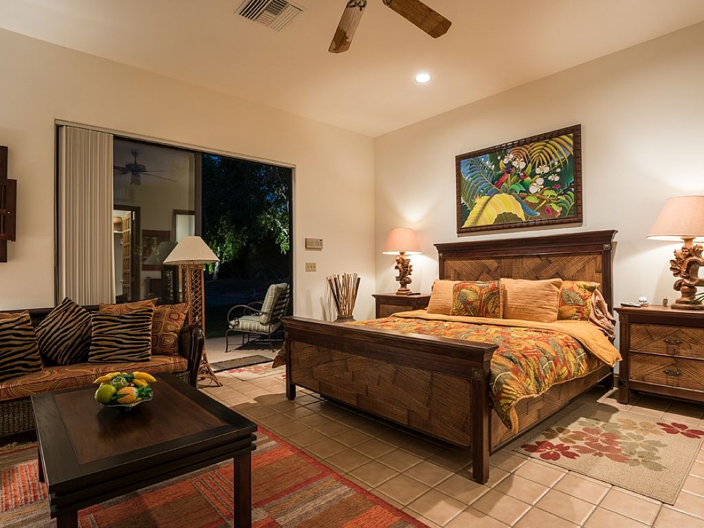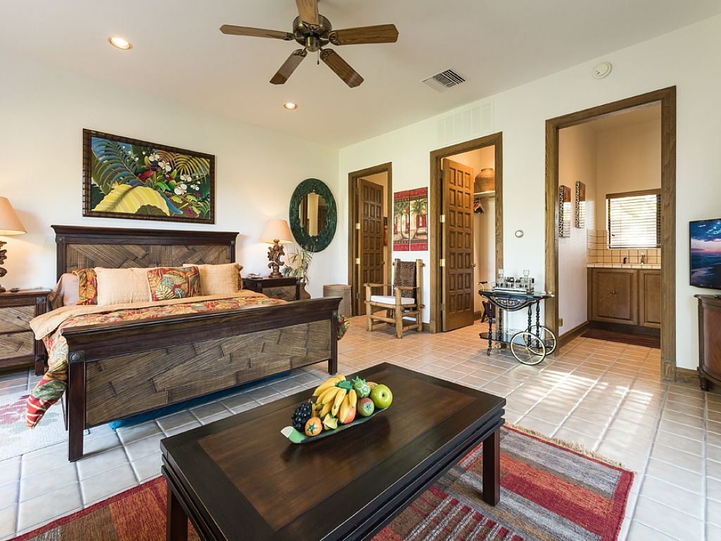 The Master bedroom features a King bed, a large sitting area with a Samsung LED TV. The En Suite bath is enormous and contains a large soaking bathtub and a large separate double faucet walk-in shower.