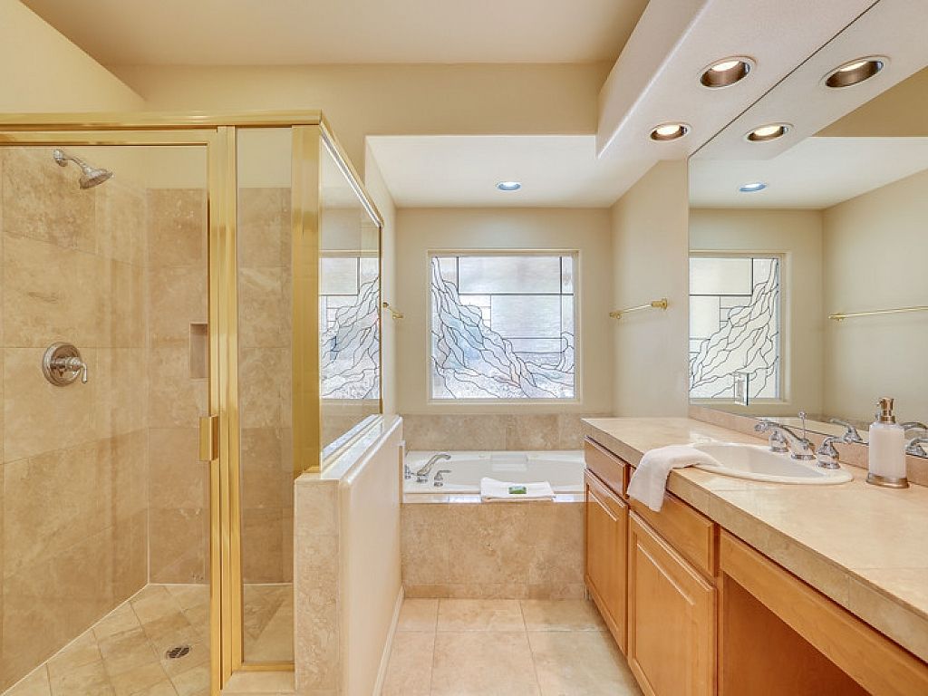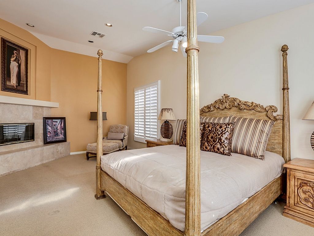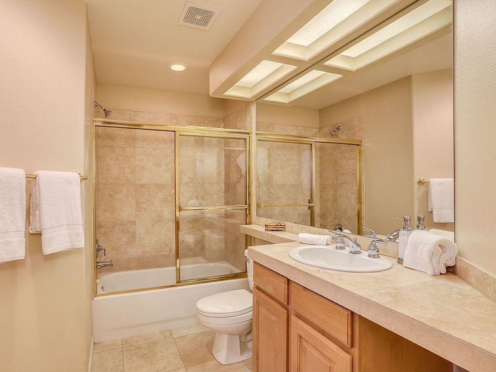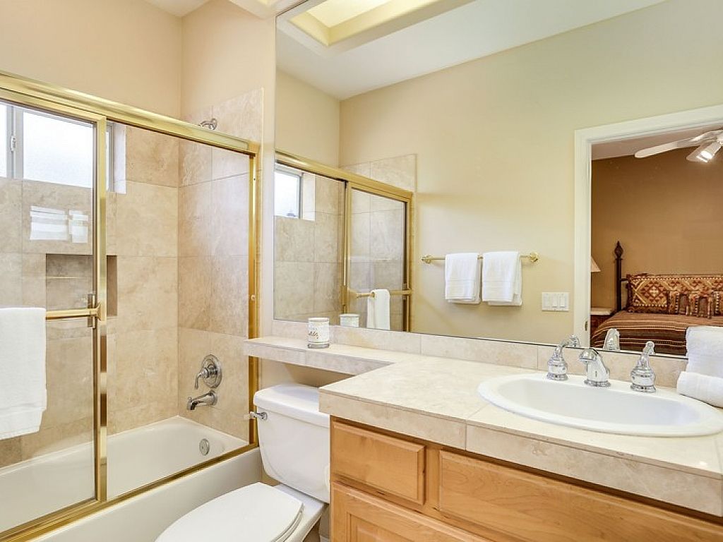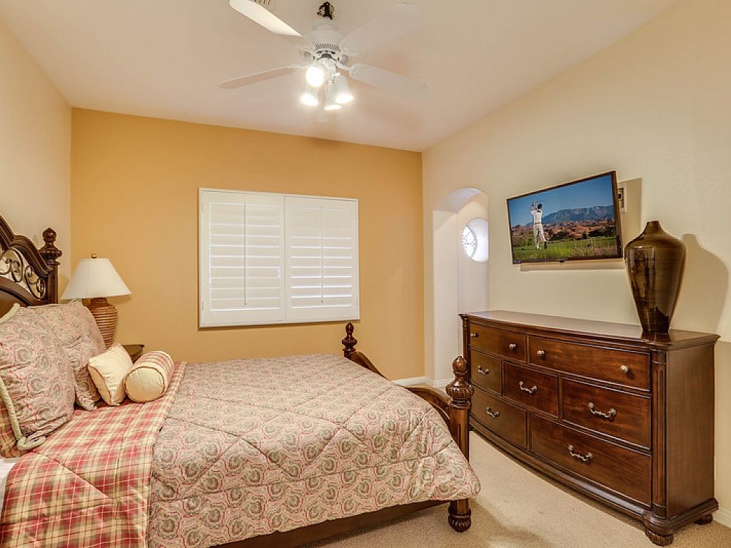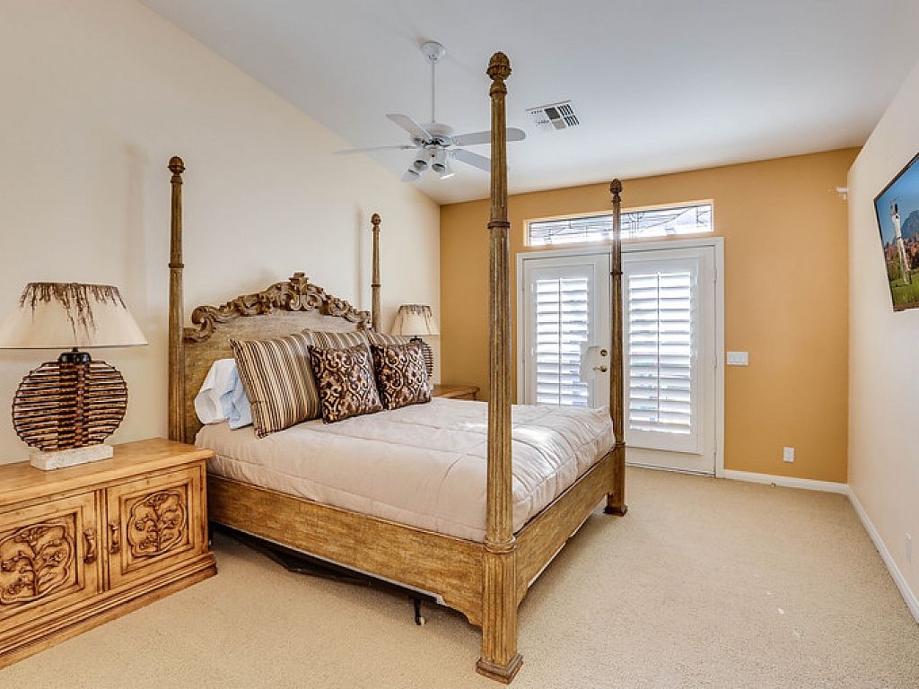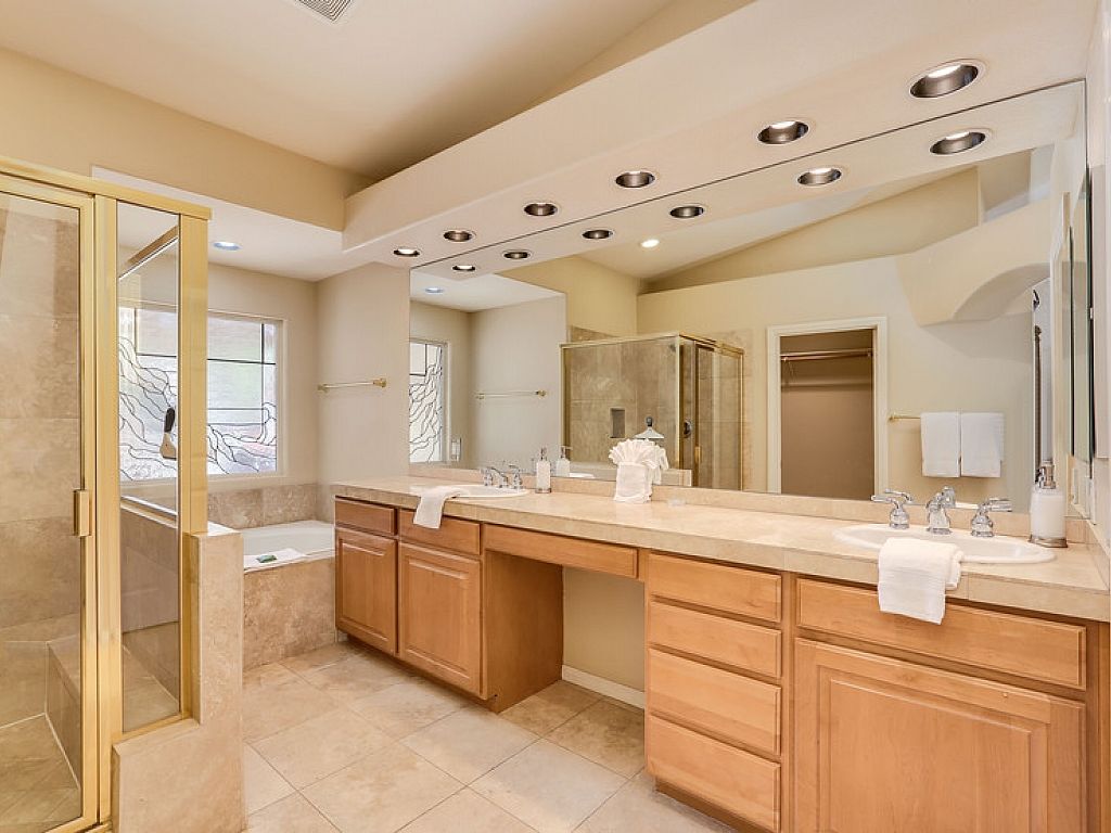 The master suite showcases a CA King bed, 40" HDTV, and enjoys direct access to the pool deck. It has an oversize en-suite master bathroom with a large soaking tub, walk-in shower, and a large walk-in closet.