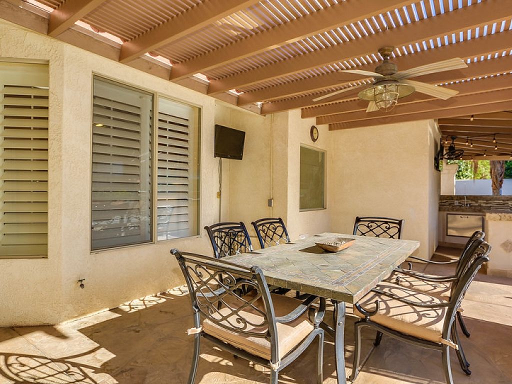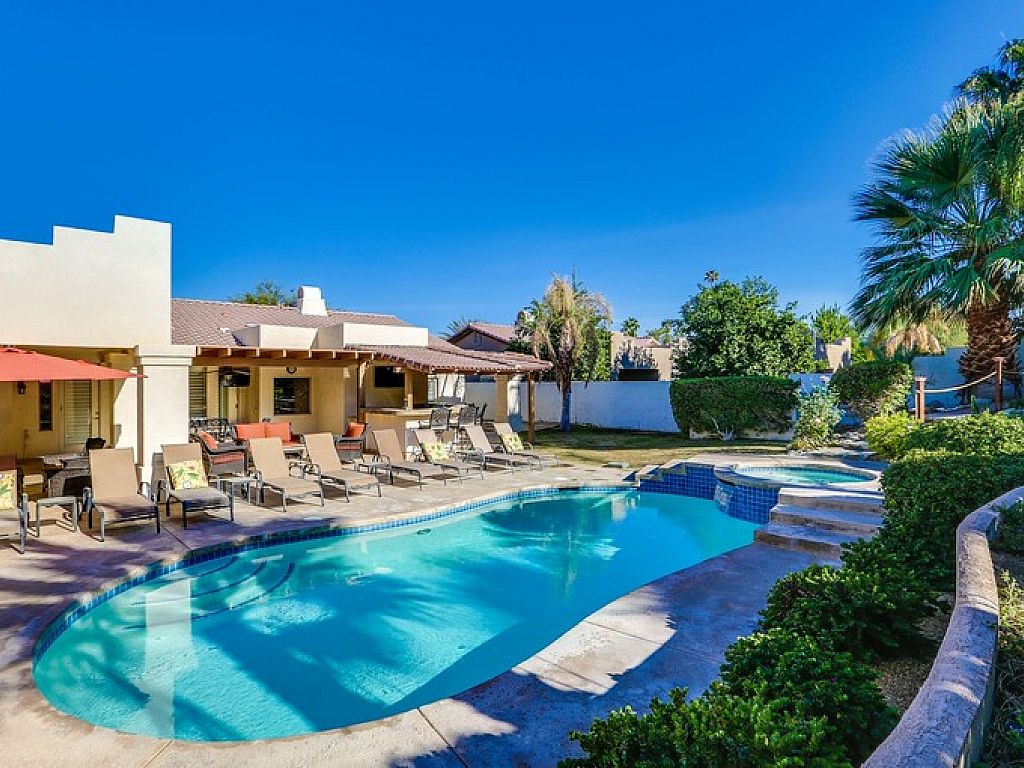 This Rancho Mirage vacation home has it all: glass doors and windows that showcase the backyard pool, an open floor plan that is perfect for family gatherings and entertaining guests. Enjoy your meals at the expansive covered BBQ grilling station while appreciating the gorgeous views of this desert oasis.