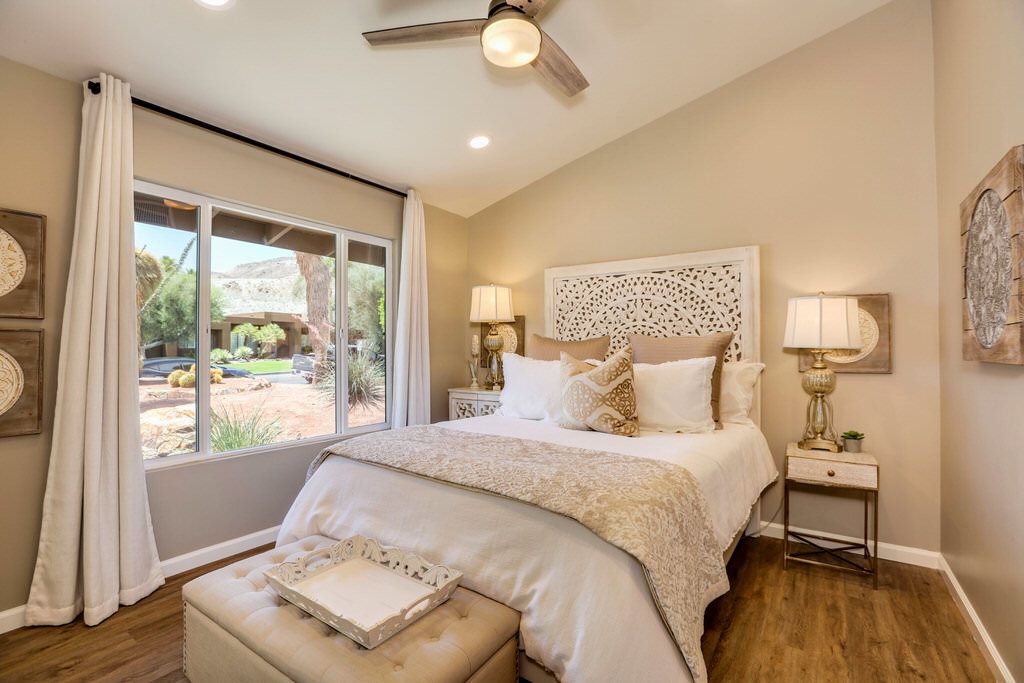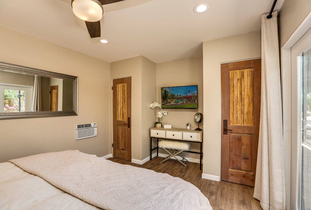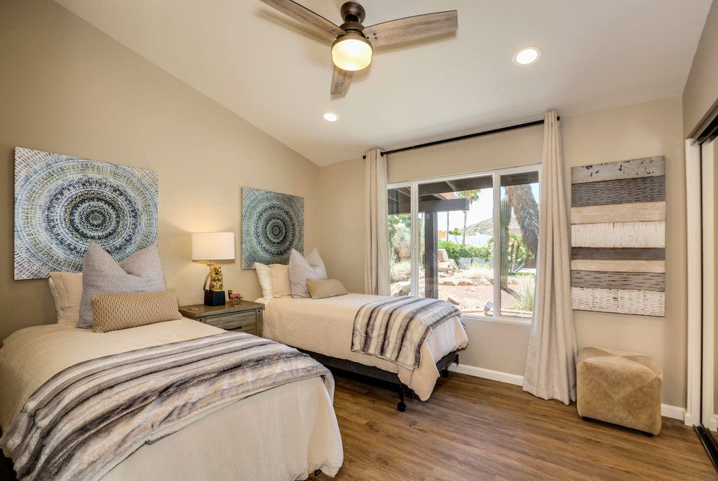 In the master bedroom you will find a king size bed, en-suite bath, 50"" TV and large windows that face the amazing landscaped backyard and pool area. The first guest bedroom also has a king size bed with 38"" TV, the third bedroom features two lx twin size beds with 32"" tv.