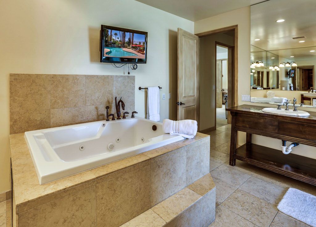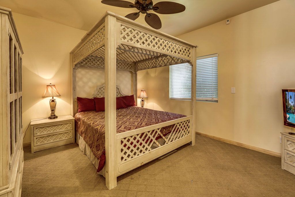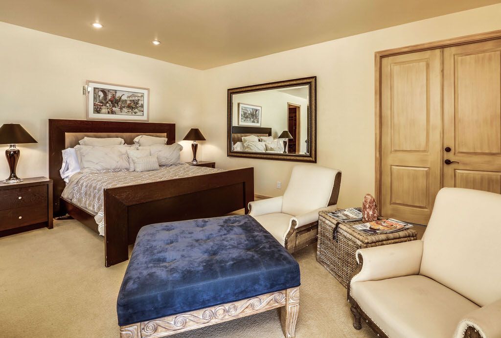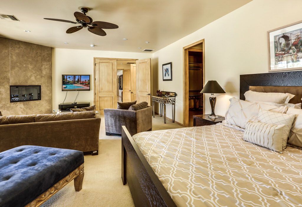 We cordially invite you to cross the double door threshold of your impeccable master bedroom suite, complete with sitting room/office with a plasma TV, crackling fireplace, two additional large screen TV's, cavernous walk-in closet, decadent master bathroom appointed with: spa tub, large walk-in shower, dual sinks and a piece de resistance salon area.