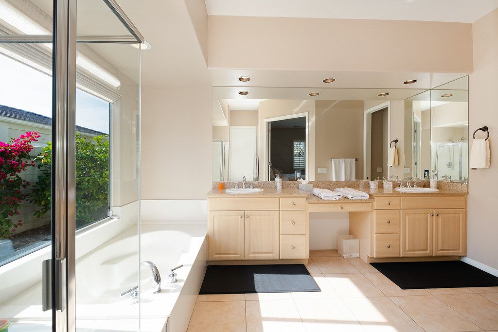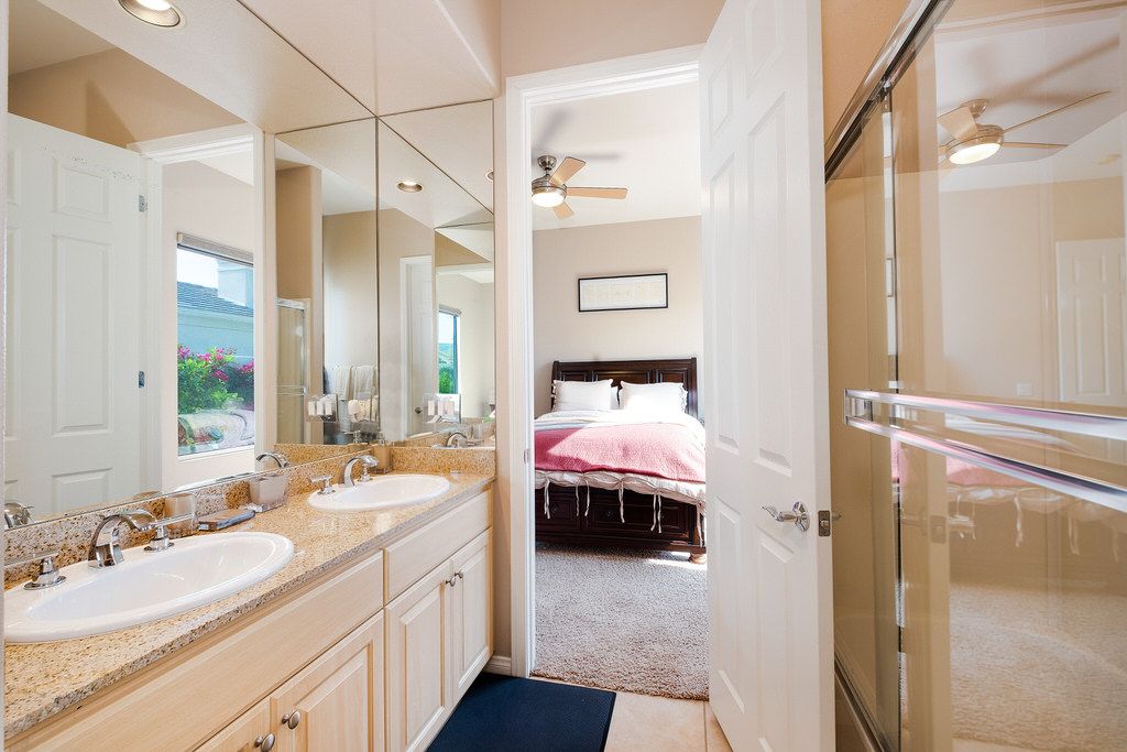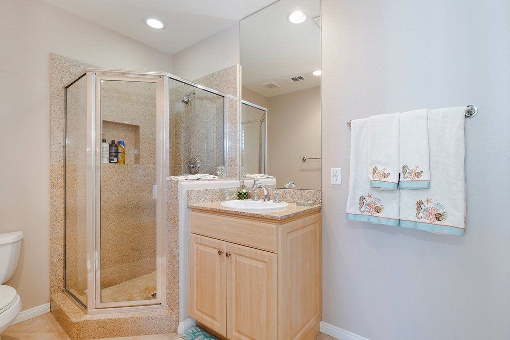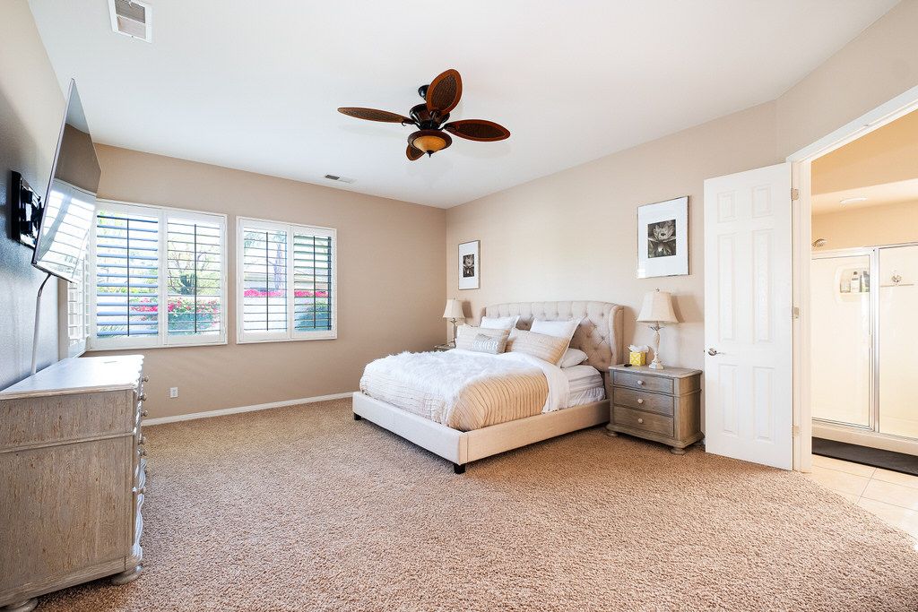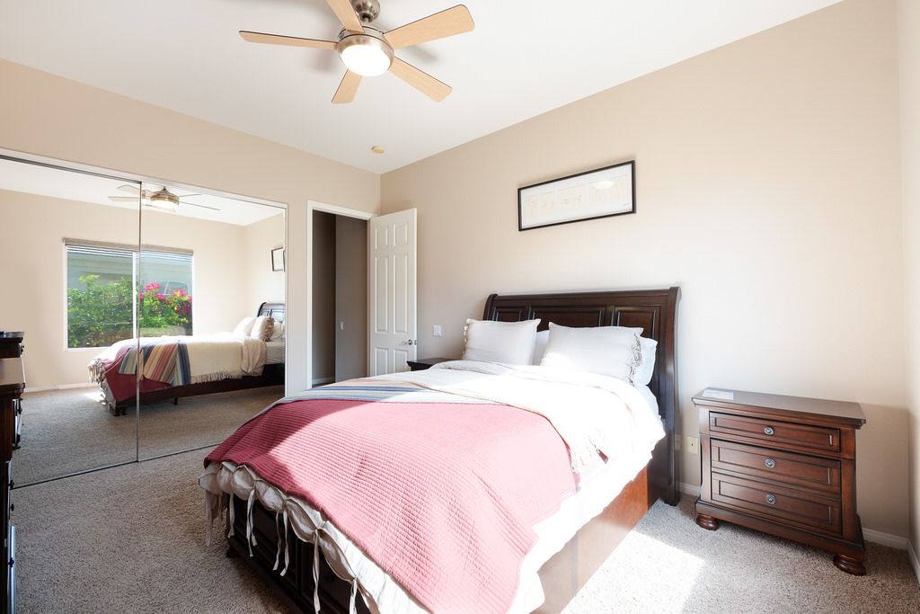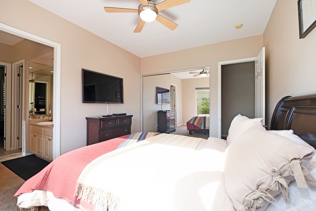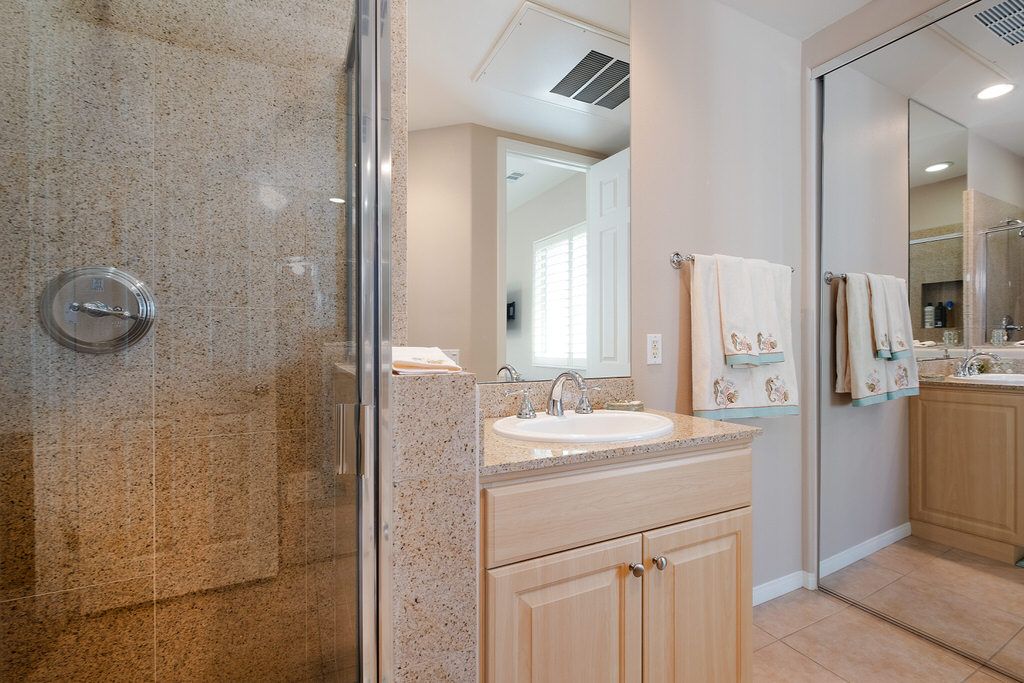 Outside sit under the covered patio with lush professionally landscaped grounds that surround the private saltwater pool and spa with ambient lighting. Enjoy the California sun in one of the many lounge chairs or relax in shady grass area with a book and enjoy the peace and quiet of this upscale community.