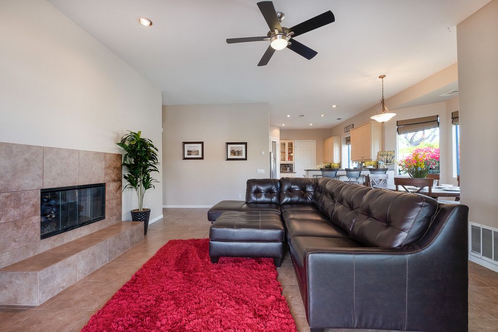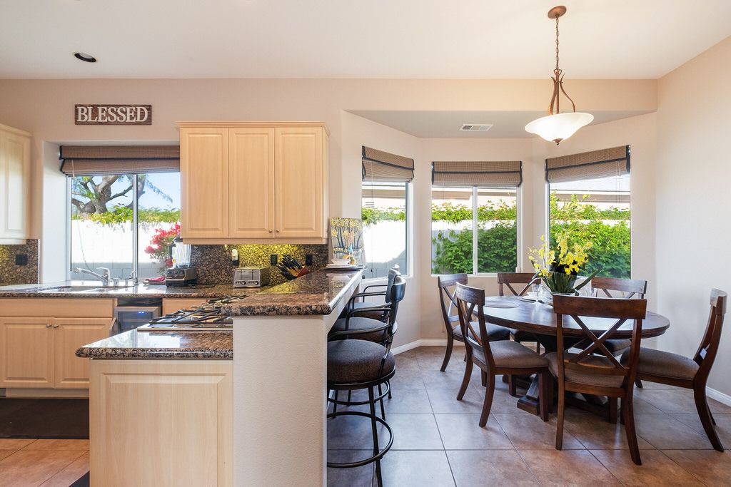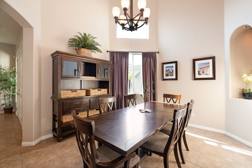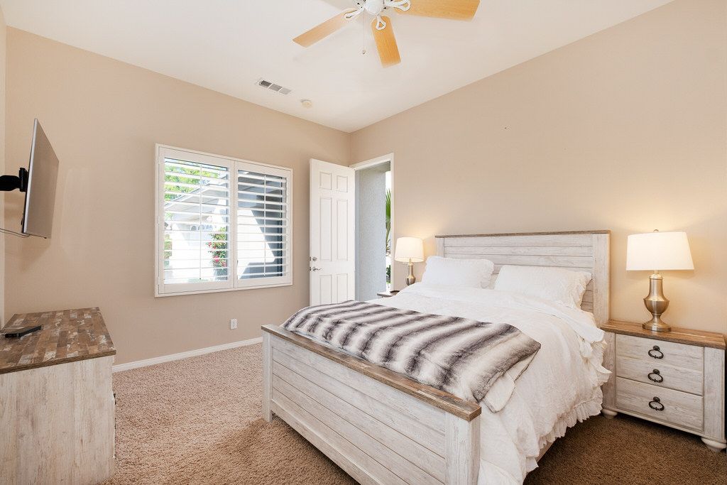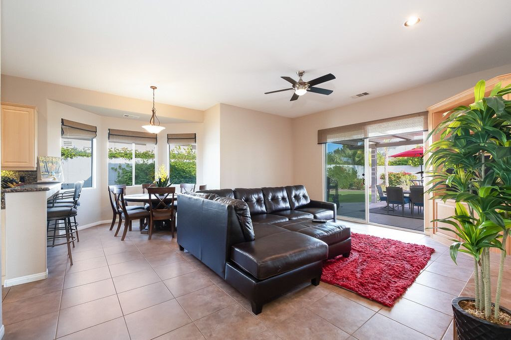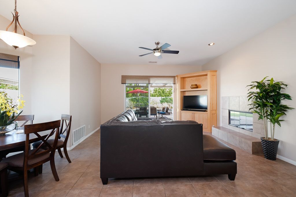 In the great room, you will find high ceilings, a fireplace, comfortable seating, large sliding doors and windows that promote the indoor/outdoor lifestyle the California desert is famous for. There is an additional family room also with large sliding glass doors leading outside that is perfect for watching TV, playing board games, or just relaxing with friends or family.
