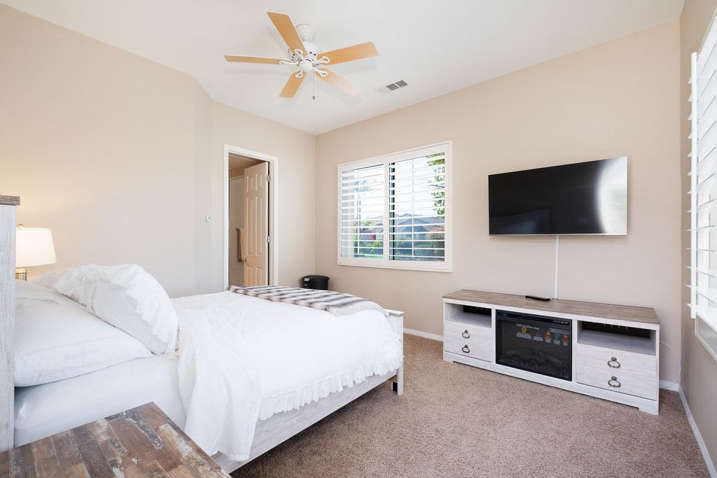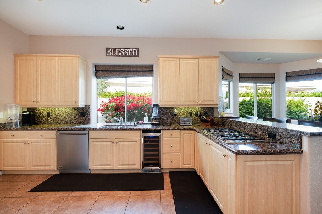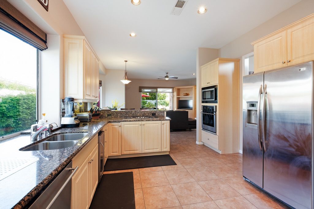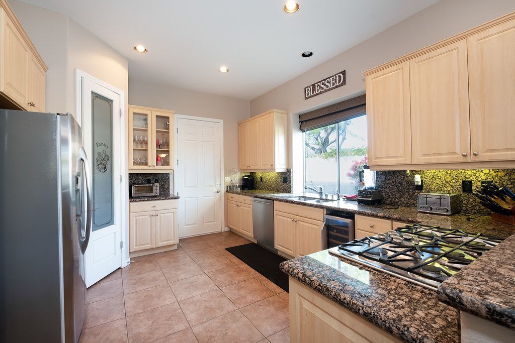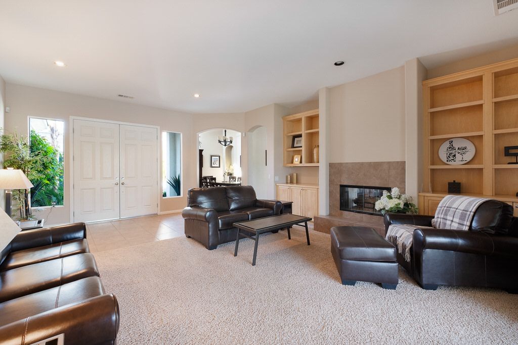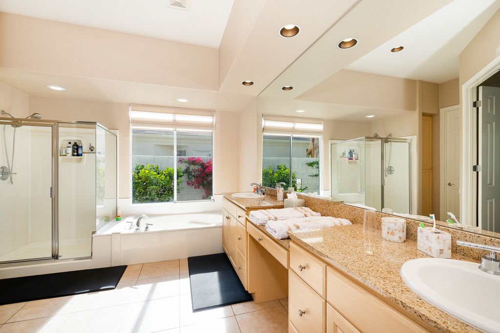 In the great room, you will find high ceilings, a fireplace, comfortable seating, large sliding doors and windows that promote the indoor/outdoor lifestyle the California desert is famous for. There is an additional family room also with large sliding glass doors leading outside that is perfect for watching TV, playing board games, or just relaxing with friends or family.