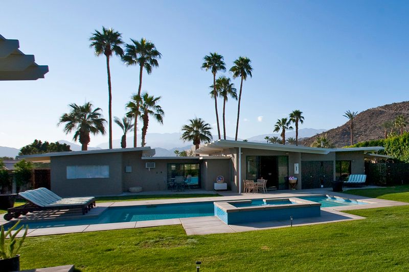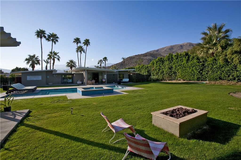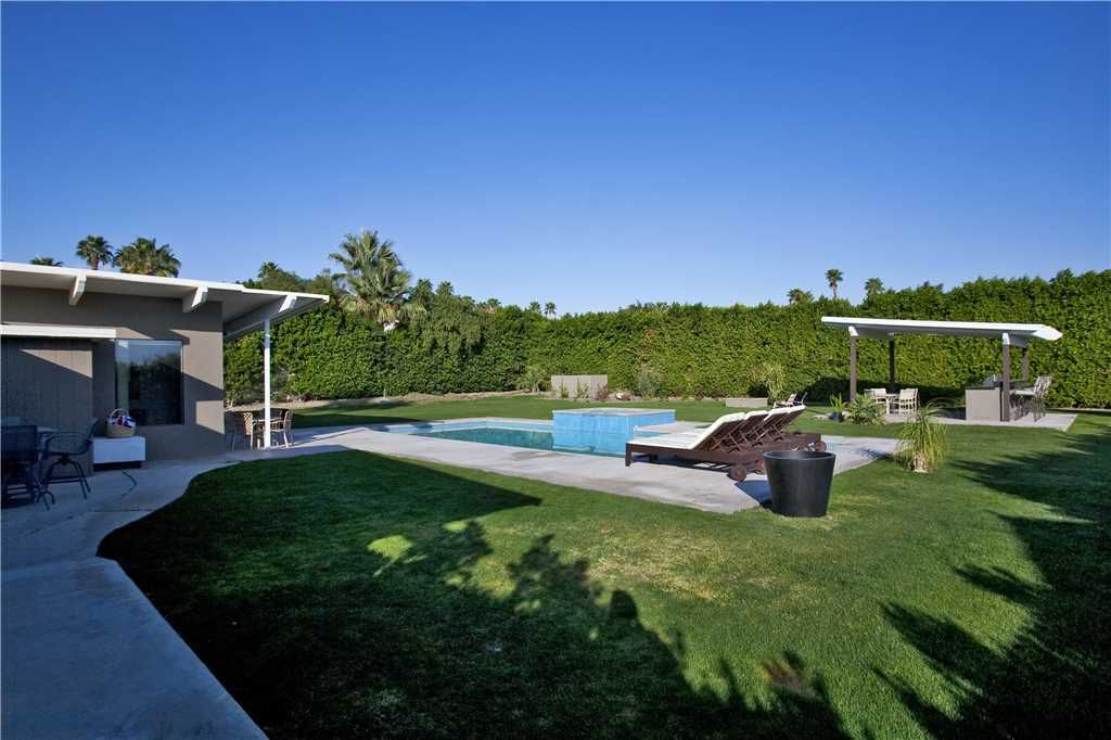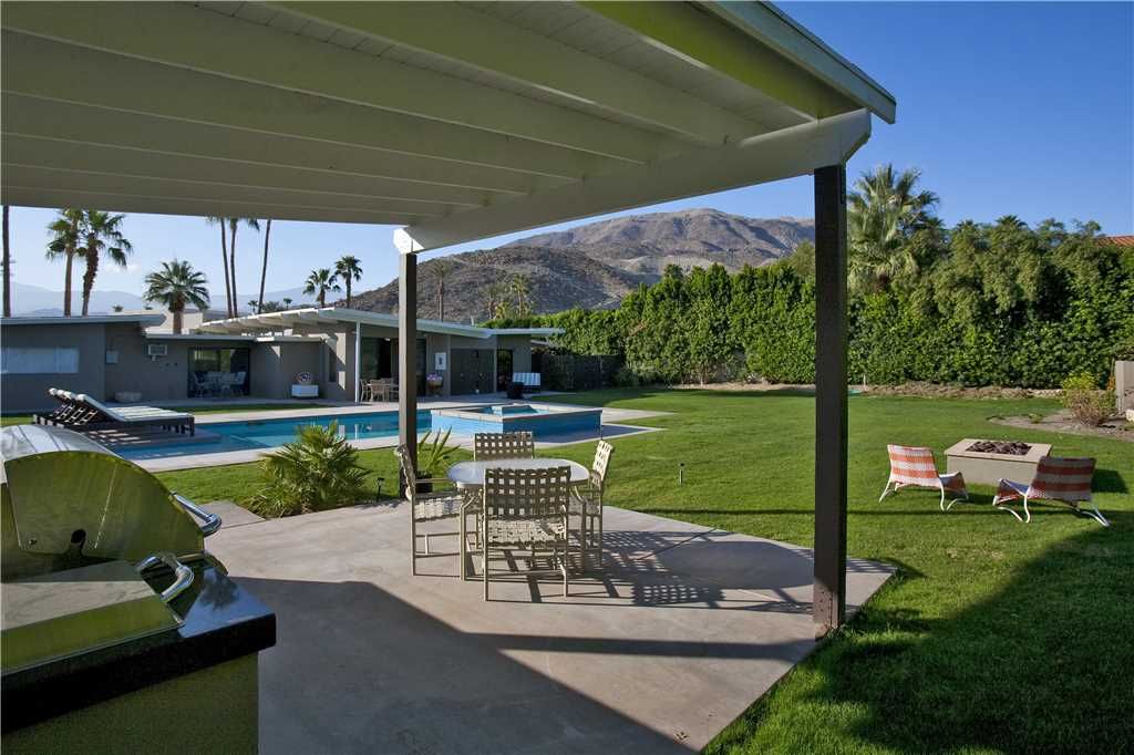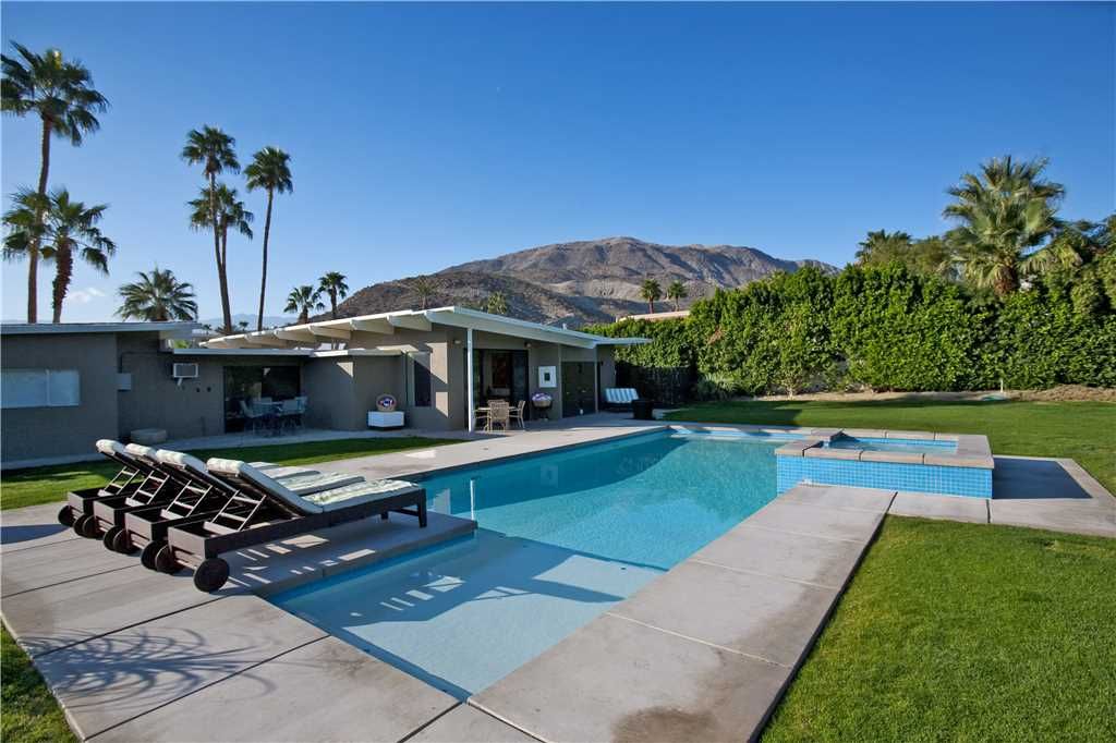 This 3 bedroom and 2 bathroom Rancho Mirage mid-century modern vacation rental is sun-filled and open with a large pool for swimming and sunning - plus beautiful mountain views.