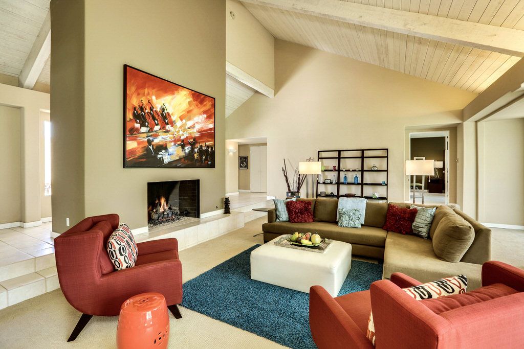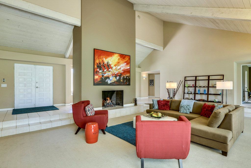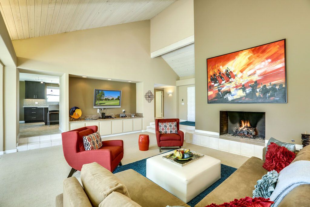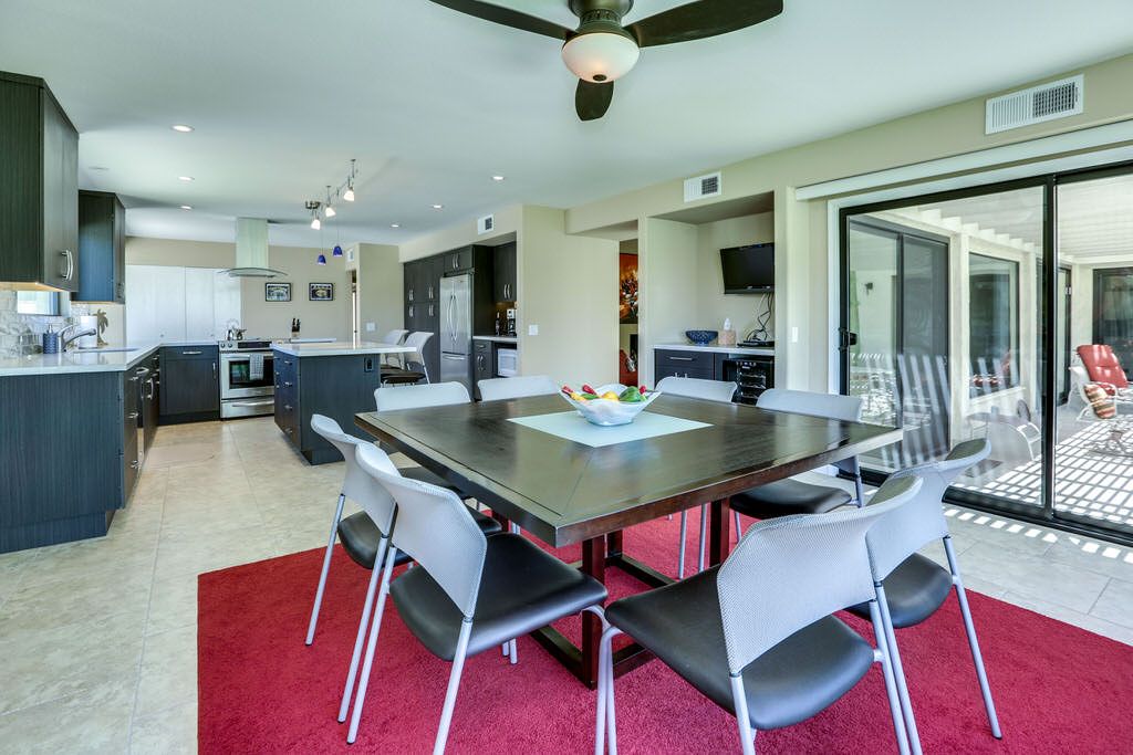 The spacious living room with soaring vaulted ceilings features a lovely fireplace, 60 inch HDTV, plush and comfortable sofa seating and classic decor. The views form every angle are spectacular. The dining area is just off the living room and has gorgeous views of the Palm Springs Mountains.